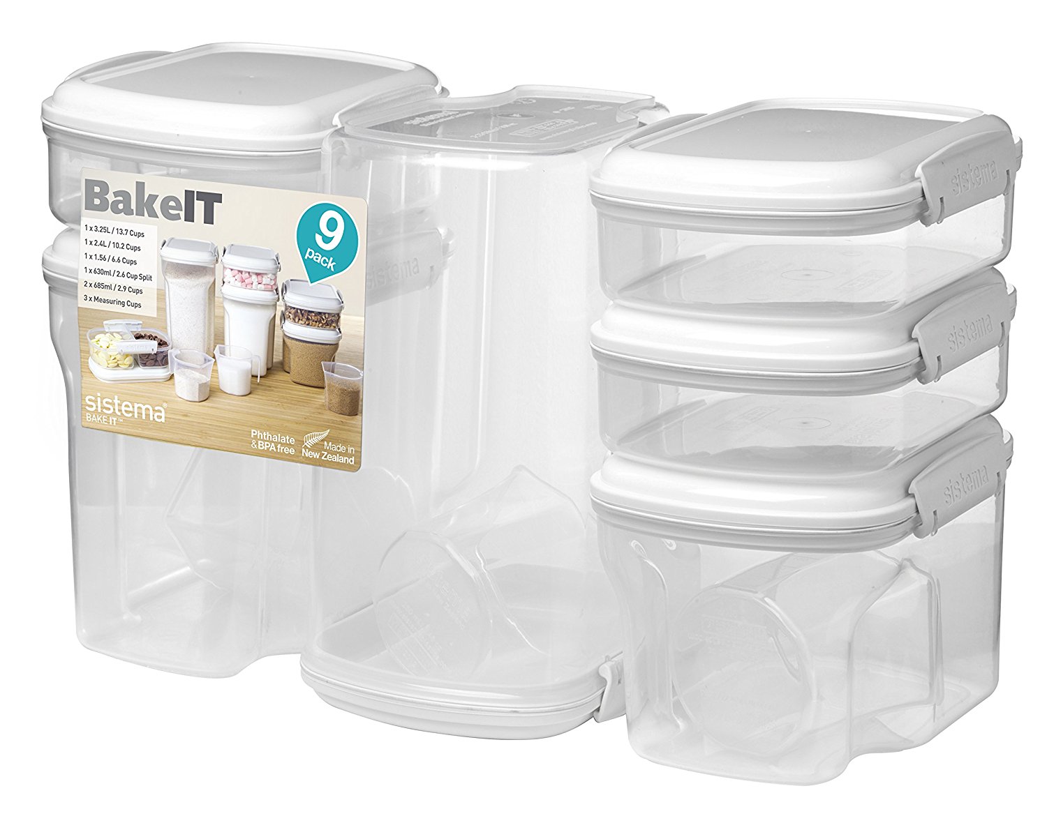 Amazon offers the Sistema Bake It 9-Piece Food Storage Set for $19.94with free shipping for Prime members. That's the lowest price we could find by $3. It includes three measuring cups, 21.3-oz., 6.6-cup, 10-cup, and 13.75-cup containers, and two 23-oz. containers.