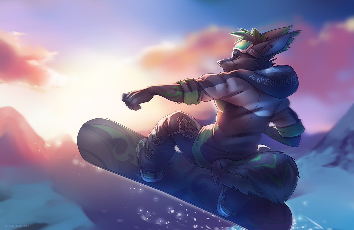 General: #anthro #male #solo #hair #clothing #fur #clothed #digital-media #2017 #outside #eyewear #black-fur #sky #detailed-background #green-hair #day #goggles #snowboarding