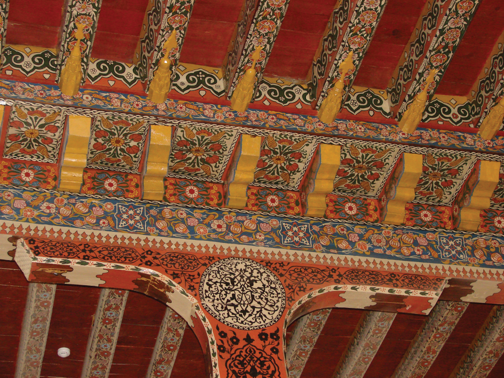 İç mekandaki tavan ahşap kirişlerden oluşmuştur. Kuzeyde bulunan kadınlar mahfilinin tavanındaki kirişlerin arasında ise süslemede renkli bitki ve çiçek motifleri kullanılmıştır.