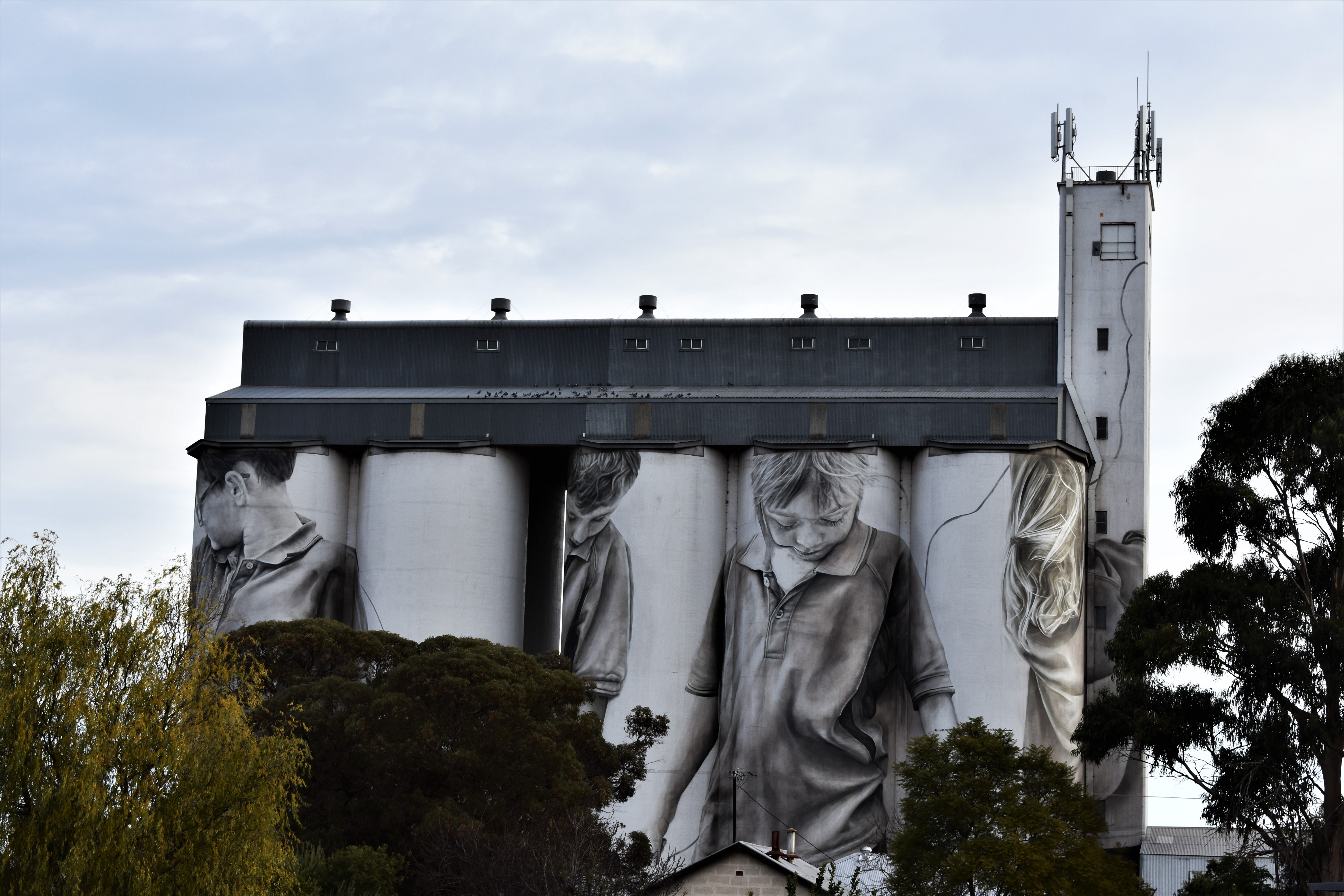 A photo of Street art on silos I found when travelling recently for #architecturalphotography.