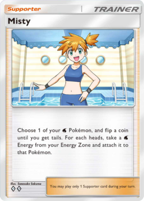 This supporter card is an anti-Misty card. Misty allows you to attach Water energy to any Water Pokemon (Active or Benched). Decks or players who want to stall and or disrupt opponents will take chances with Team Rocket Grunt.