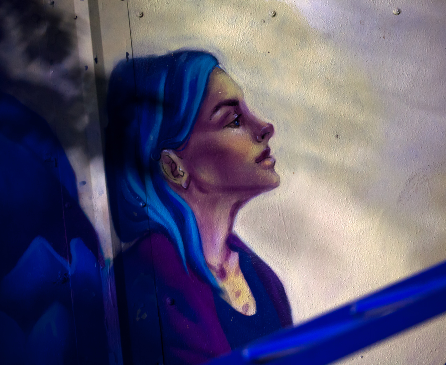 I am not sure what is drawn here exactly, it looks like a blue hop cone for me (can they be blue?) Maybe it's something else. Plus a very melancholic and beautiful female portrait, which I enjoyed the most. No pathos or glamor, I would say the words "gentle" and "pure", but in English 'dreamy' comes to mind - dreamily. I only had a 150mm tele-macro lens with me, just in order to photograph her beautiful eyes.