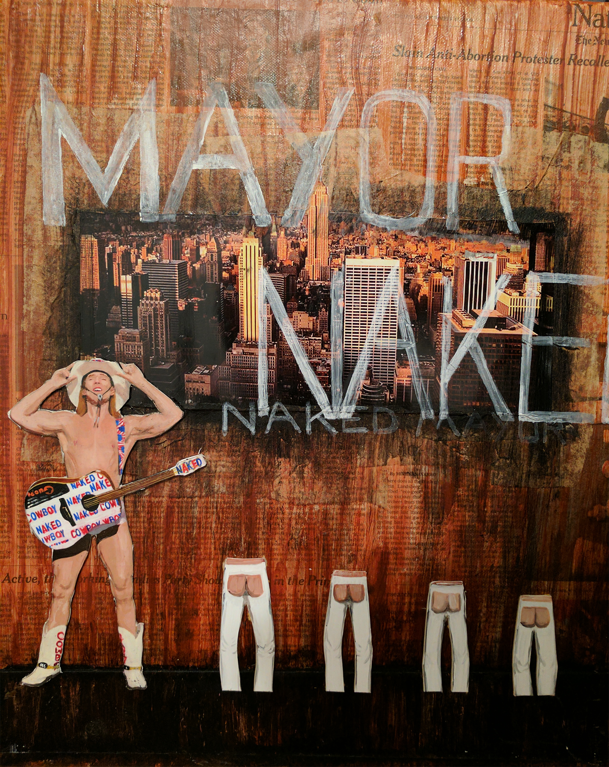 Does anyone remember when this guy put in a bid to run for mayor of NYC in 2009? I do. Sometimes when I'm down I like to imagine him singing press conferences. Shaking his booty in the face of naysayers (literally). Wearing a tie and briefs to the office (and nothing else). I made this back when it happened, but just like I remember how funny this was at the time, I sometimes get a smile out of this painting/mixed media collage I did back in the day. Thought some of you would enjoy it, too!