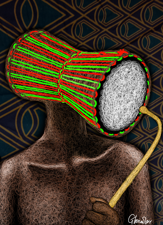 this artwork is connected with the african culture, nature, music and the gangan-drum in english talking drum.