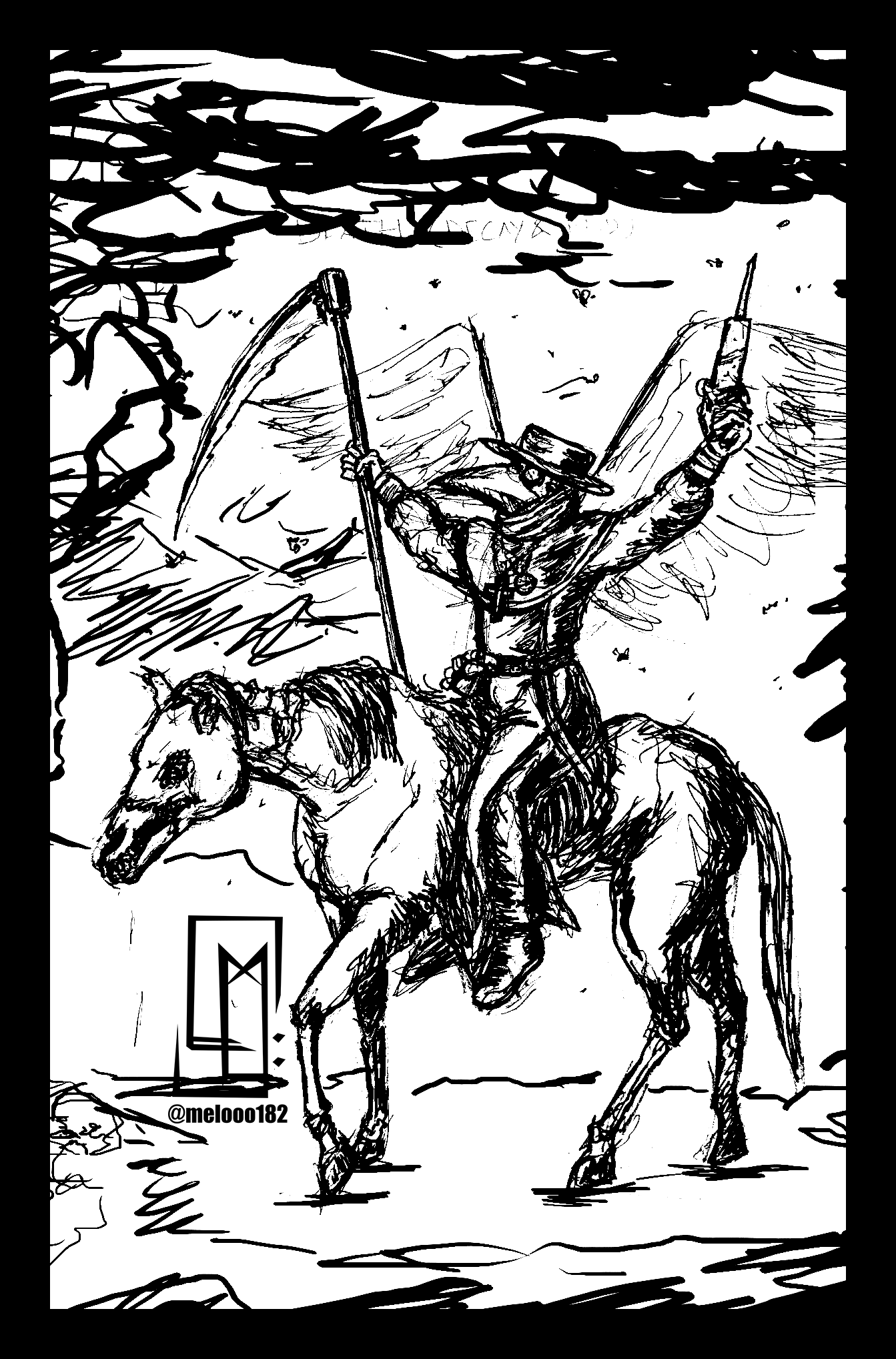I repurposed my earlier design for Pestilence (conquest) which fits better as a the Plague Harbinger and Death, a Plague Doctor riding a zombie horse followed by swarms of insects spreading diseases.