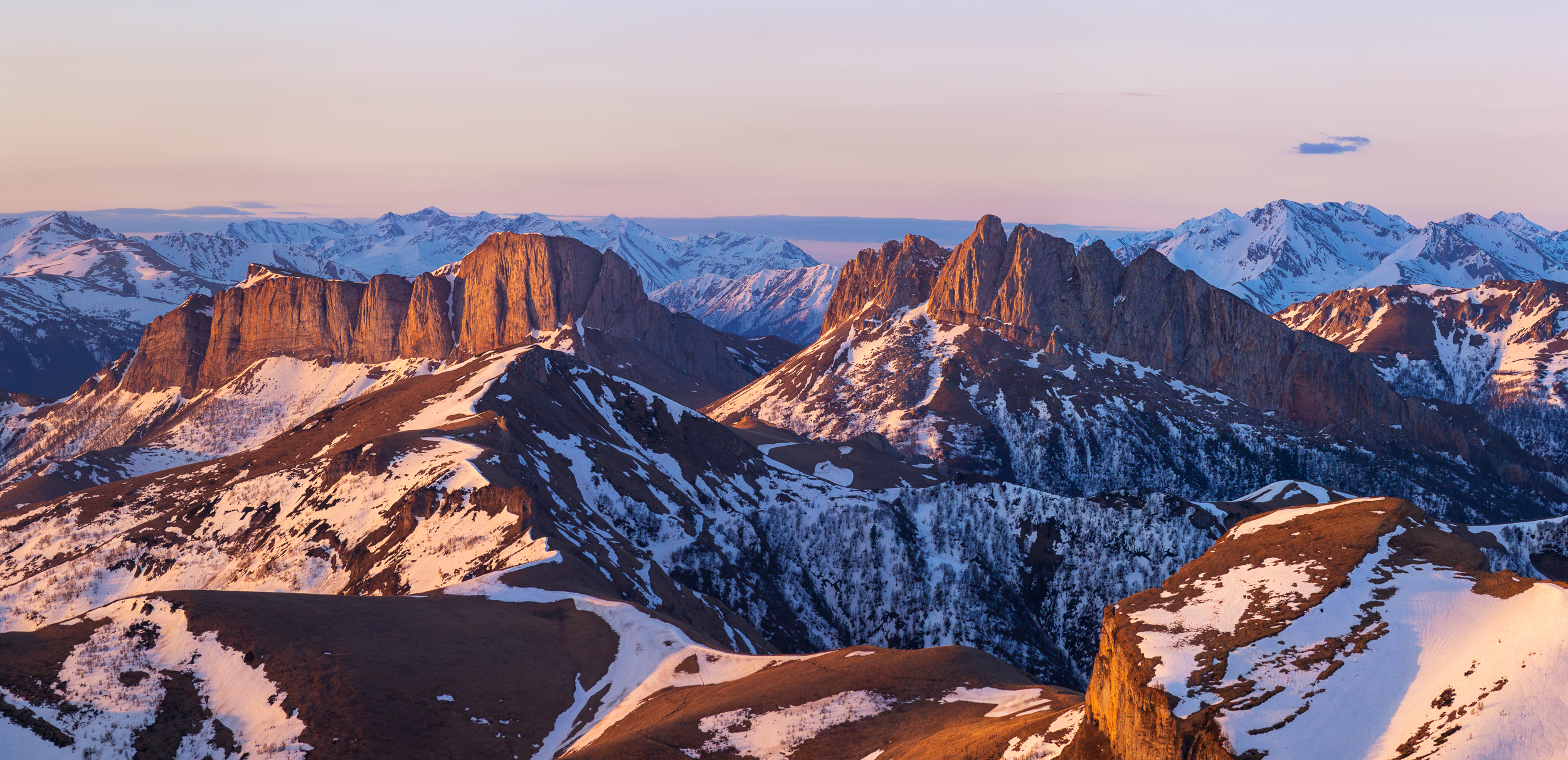 Two peaks that you see to the right and left of the center of the photo — Western and Eastern Acheshbok. They are popularly called together the "Devil's Gate". This is a view from the top of Bolshoi Thach in Adygea, where we met the dawn. At that time it was my first night on the top of the mountain. It was a bright event that I definitely remembered for a lifetime.