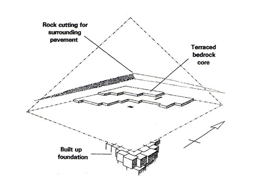 We focus here upon the Second Pyramid, as having been built upon quite sloping ground, 3-6° of incline. In one corner, a huge expanse of solid rock was ‘bulldozed’ away to make a level surface, while at the other end huge cubic blocks of three metres side-length, weighing some two hundred tons each, were used to build up the level surface. That trouble could have been avoided, by moving the site a short distance, indicating that there was something vital about that location. Quoting Robin Cook, who wrote two books about the Legon ground-plan: ‘Why else build up the eastern side of Khafre’s pyramid on a giant megalithic platform when, a short distance West, it could have been founded upon natural rock?’ (6) Ralph Ellis has also commented upon how this second pyramid had been ‘countersunk into the bedrock:’ ‘The Bronze Age solution to this defect on the topography of the chosen site was ‘simple’: just form a thick raft of megalithic blocks, each weighing in at hundreds of tonnes, and then build the pyramid on top of that.’ (7) These vast blocks were finely-jointed to fit meticulously together. (8) Ellis like others discerned a stark contrast between this ‘truly astounding’ feat and construction of other, non-Giza pyramids: ‘If one looks at the third and fifth dynasty pyramids, the engineering solutions are all simple and man-manageable.’ Imaginative accounts of toiling Egyptian slaves have failed to take account of this primary phenomenon, which shifts the whole construction back into prehistory.