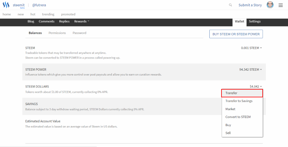 Para ello elegiremos la opción de Transfer en la sección de Steem Dollars.