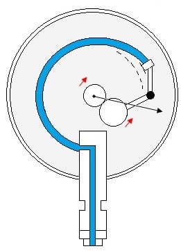 El manómetro tipo Bourdon tal como lo muestra la siguiente figura; consta de un tubo fino, el cual uno de sus extremos está cerrado y el otro es conectado al fluido a estudiar. La presión transmitida al tubo ocasiona que este se deforme, y mediante un juego mecánico se transmite ese movimiento a un dial que refleja la presión del fluido estudiado.
