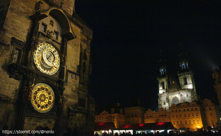 La vista de los monumentos de Praga durante las noches es realmente bonita. La presente foto corresponde a la Plaza de la Ciudad Vieja. En el primer plano se observa el reloj astronómico, el cual es uno de los monumentos de la capital checa más conocidos y data del siglo XV. En la parte de atrás de la imagen está la fachada de La Iglesia de nuestra Señora en frente del Tyn, la cual fue construida en estilo gótico. Cabe reseñar que las torres de sus campanarios son típicas de la architecture gótica de Praga.